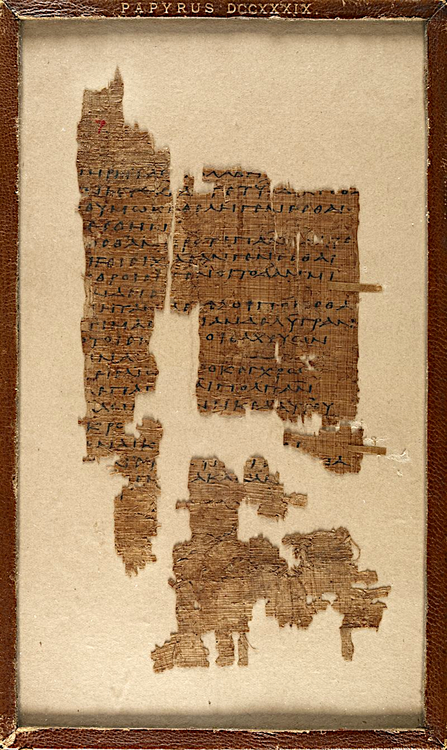 El manuscrito seleccionado es el papiro 739, datado en el s. III d. C., que se conserva en la British Library. Se trata de un poema dedicado a su hermano Caraxo, en la que Safo ora porque vuelva sano y salvo de un viaje comercial en barco a Egipto. Está escrito en caligrafía capital rústica derivada de la capital romana.